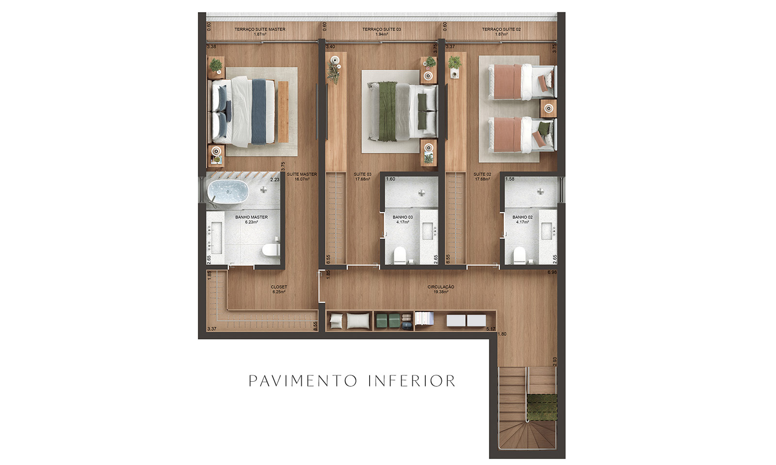 A decoração, o mobiliário e os acessórios são meramente sugestivos, não estando incluídos no preço de venda. As medidas poderão sofrer alterações de 5%. Acabamentos conforme memorial descritivo. Os vãos e esquadrias poderão sofrer alterações. As cores dos materiais apresentados nesta planta poderão sofrer alterações. Os pilares estruturais, shafts de instalações e enchimentos poderão sofrer alterações de dimensões, quantidade e posicionamento, durante o desenvolvimento do projeto. A área total indicada na planta é privativa, ou seja, tomada pelas linhas externas da fachada. Já as cotas indicadas nos compartimentos internos são úteis, desconsiderando paredes e outros elementos construtivos, conforme NBR 14.653-2 ABNT. As dimensões das bancadas dos banheiros, lavabos e cozinha (largura e comprimento) poderão sofrer alterações durante o desenvolvimento do projeto. O layout da cozinha poderá sofrer alteração. O pergolado da garagem não será entregue executado junto com a obra.