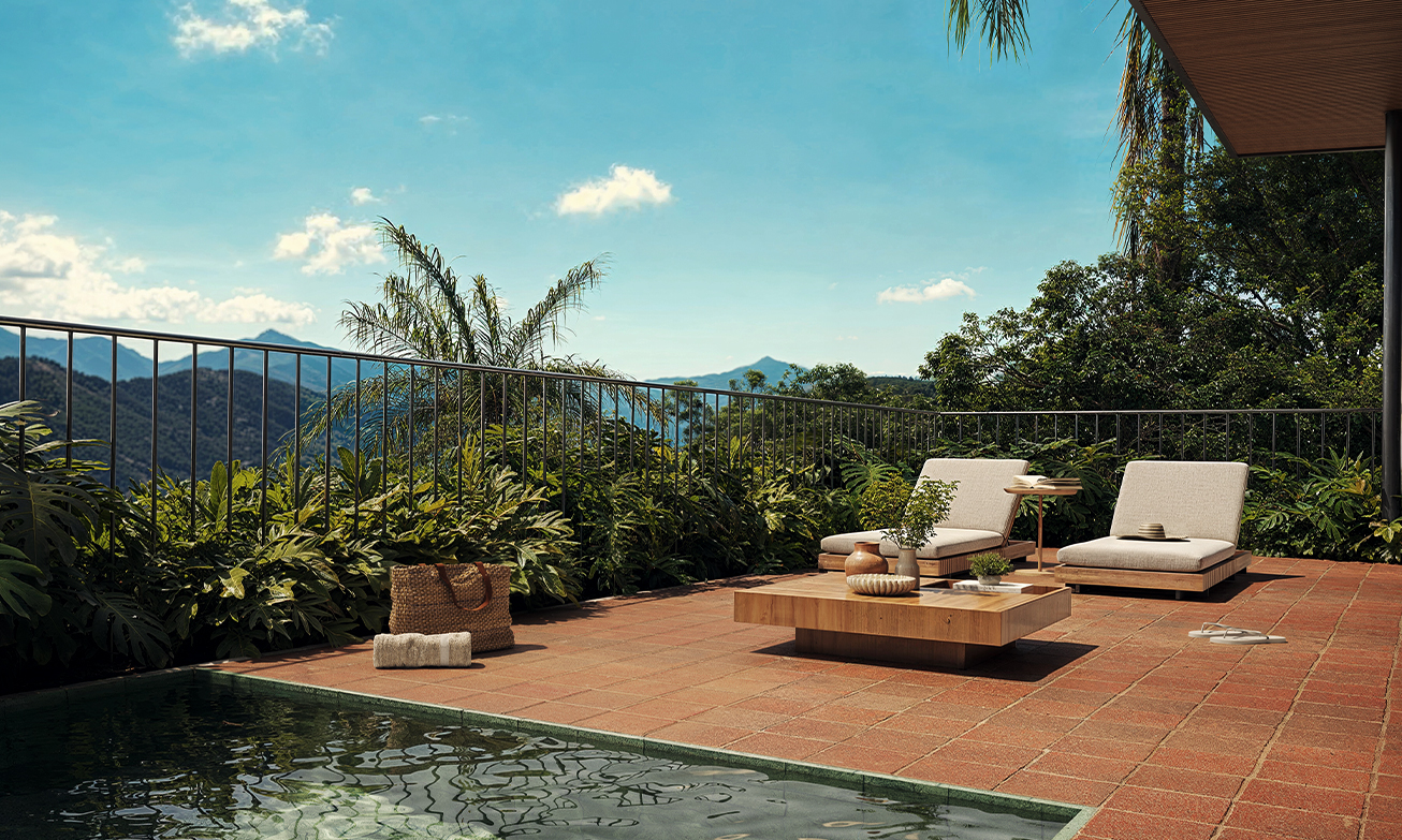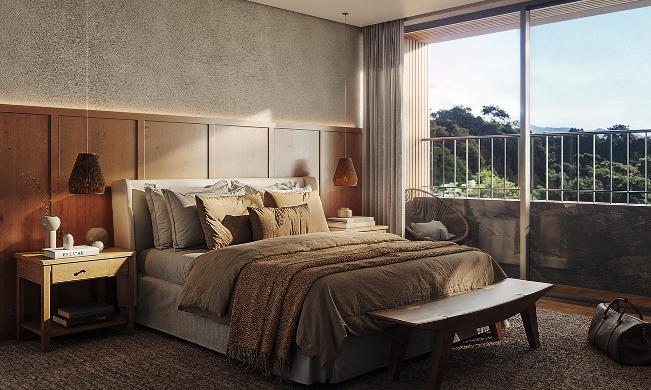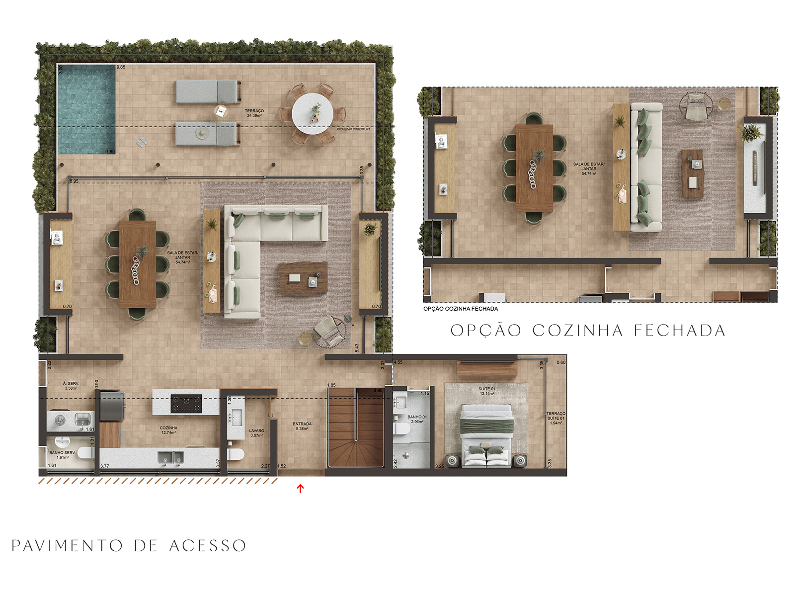 A decoração, o mobiliário e os acessórios são meramente sugestivos, não estando incluídos no preço de venda. As medidas poderão sofrer alterações de 5%. Acabamentos conforme memorial descritivo. Os vãos e esquadrias poderão sofrer alterações. As cores dos materiais apresentados nesta planta poderão sofrer alterações. Os pilares estruturais, shafts de instalações e enchimentos poderão sofrer alterações de dimensões, quantidade e posicionamento, durante o desenvolvimento do projeto. A área total indicada na planta é privativa, ou seja, tomada pelas linhas externas da fachada. Já as cotas indicadas nos compartimentos internos são úteis, desconsiderando paredes e outros elementos construtivos, conforme NBR 14.653-2 ABNT. As dimensões das bancadas dos banheiros, lavabos e cozinha (largura e comprimento) poderão sofrer alterações durante o desenvolvimento do projeto. O layout da cozinha poderá sofrer alteração. O pergolado da garagem não será entregue executado junto com a obra.
